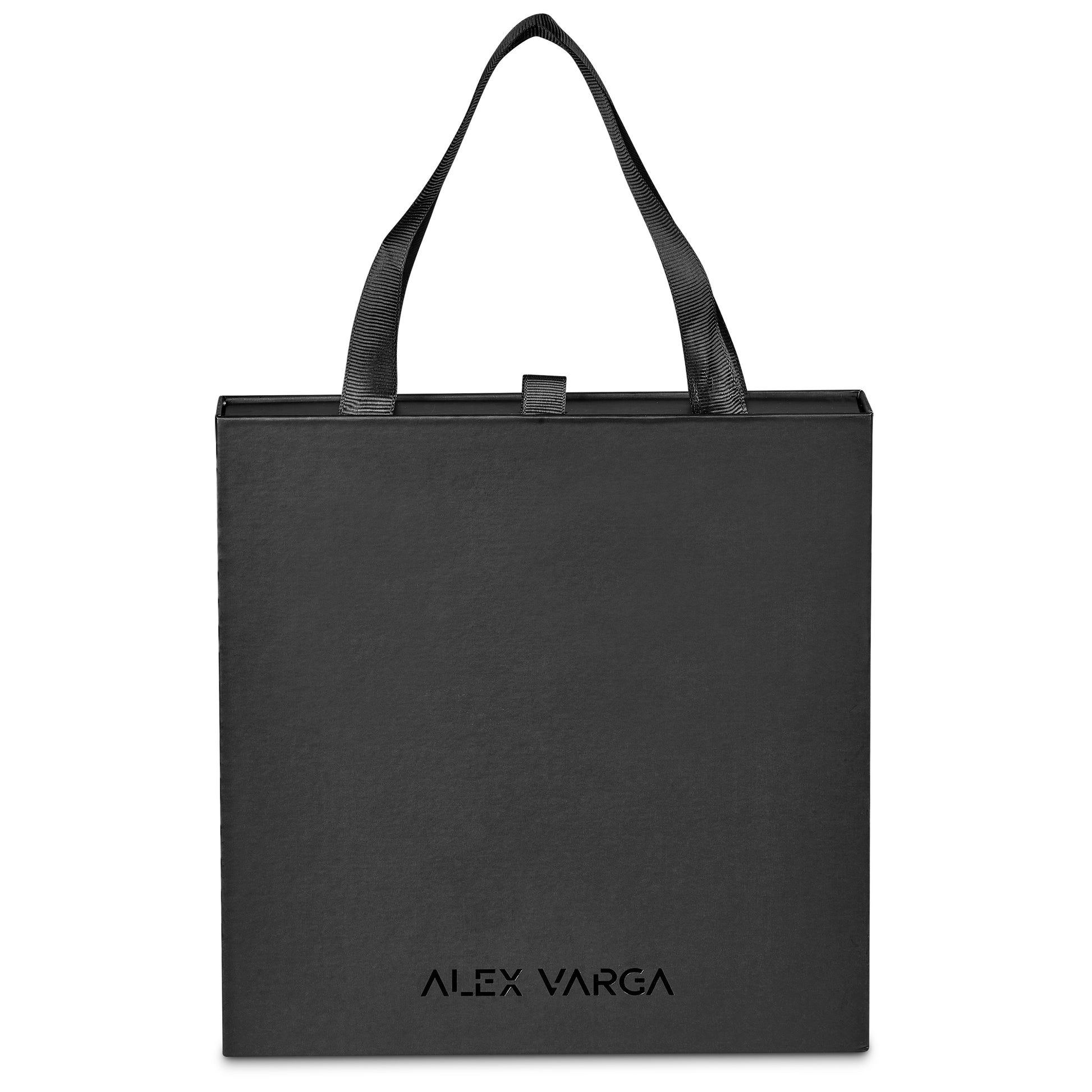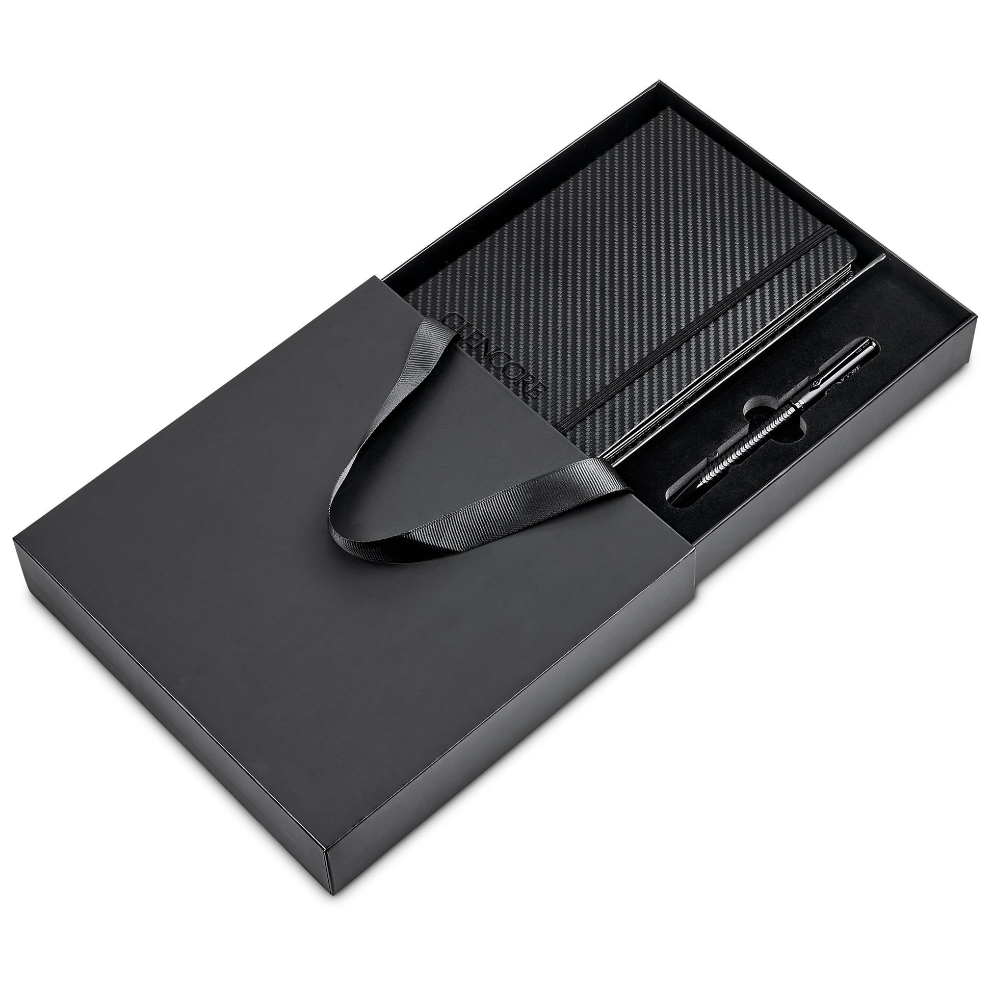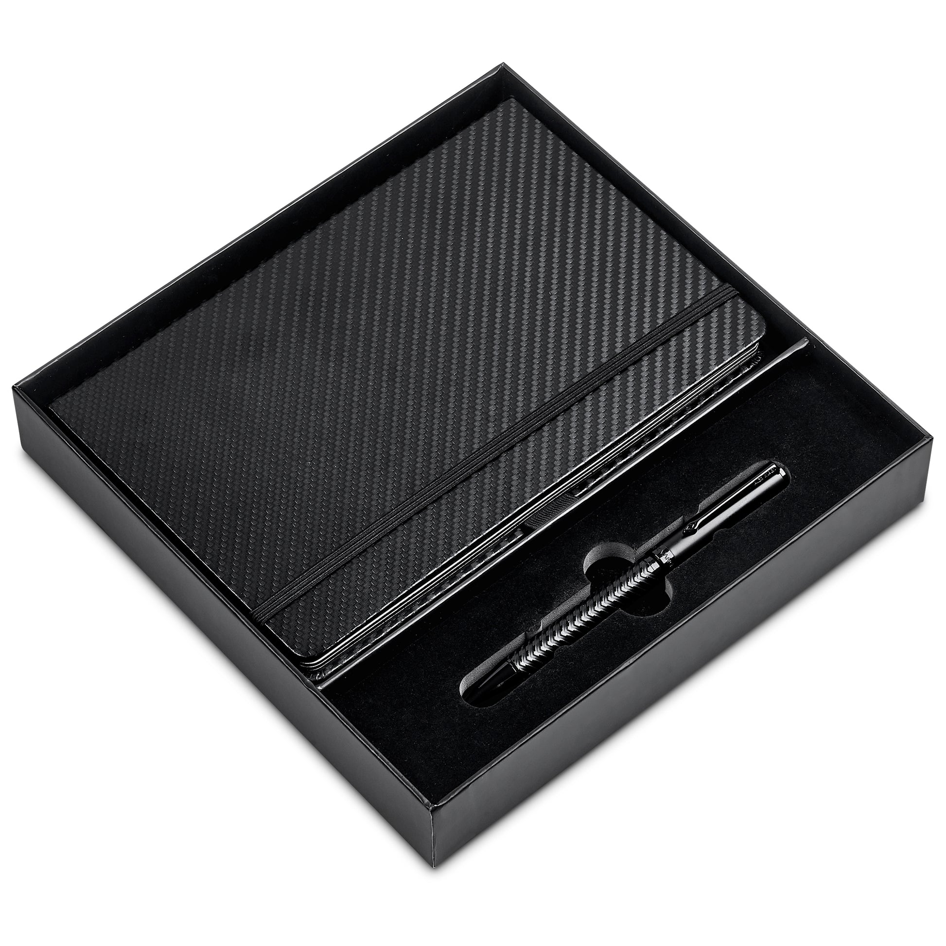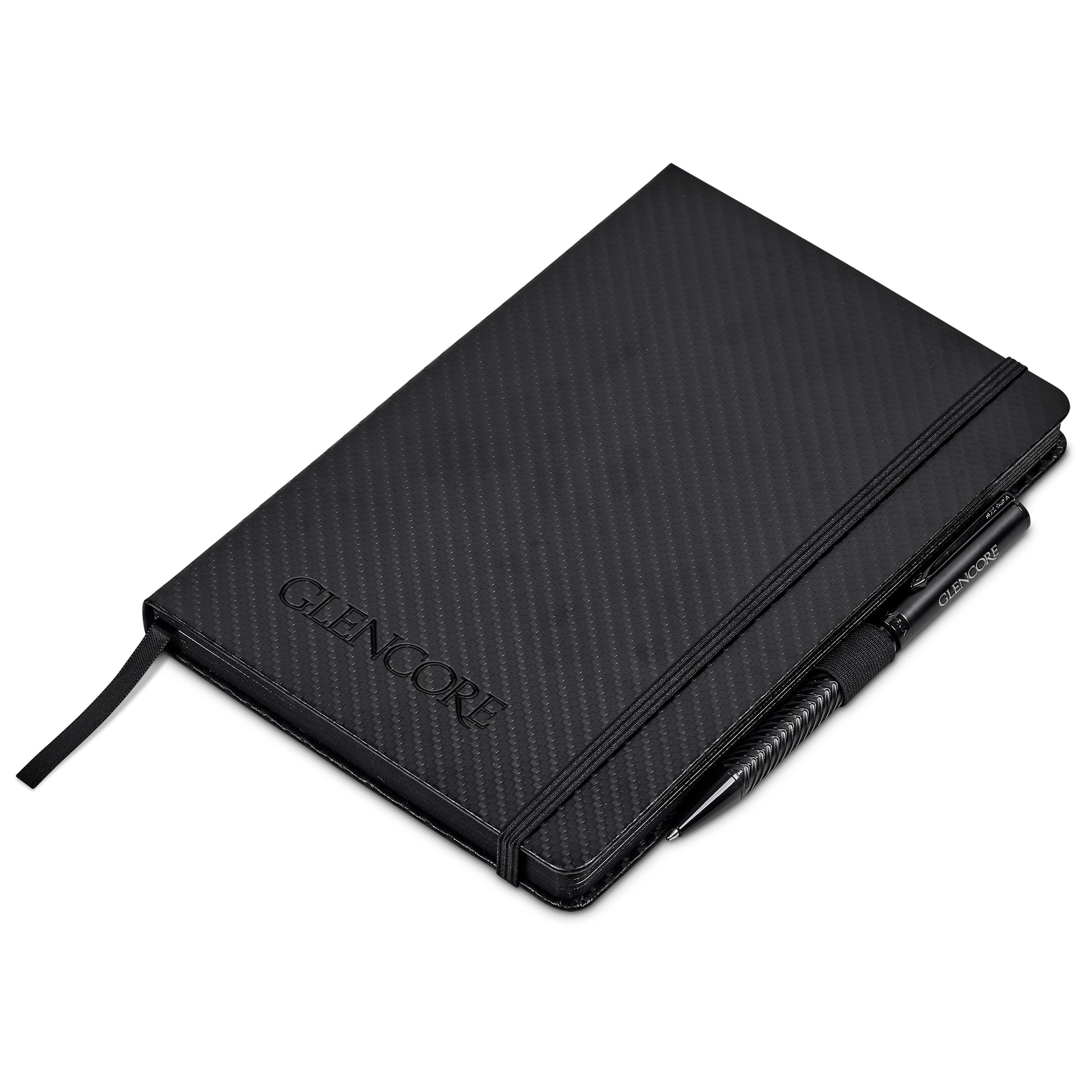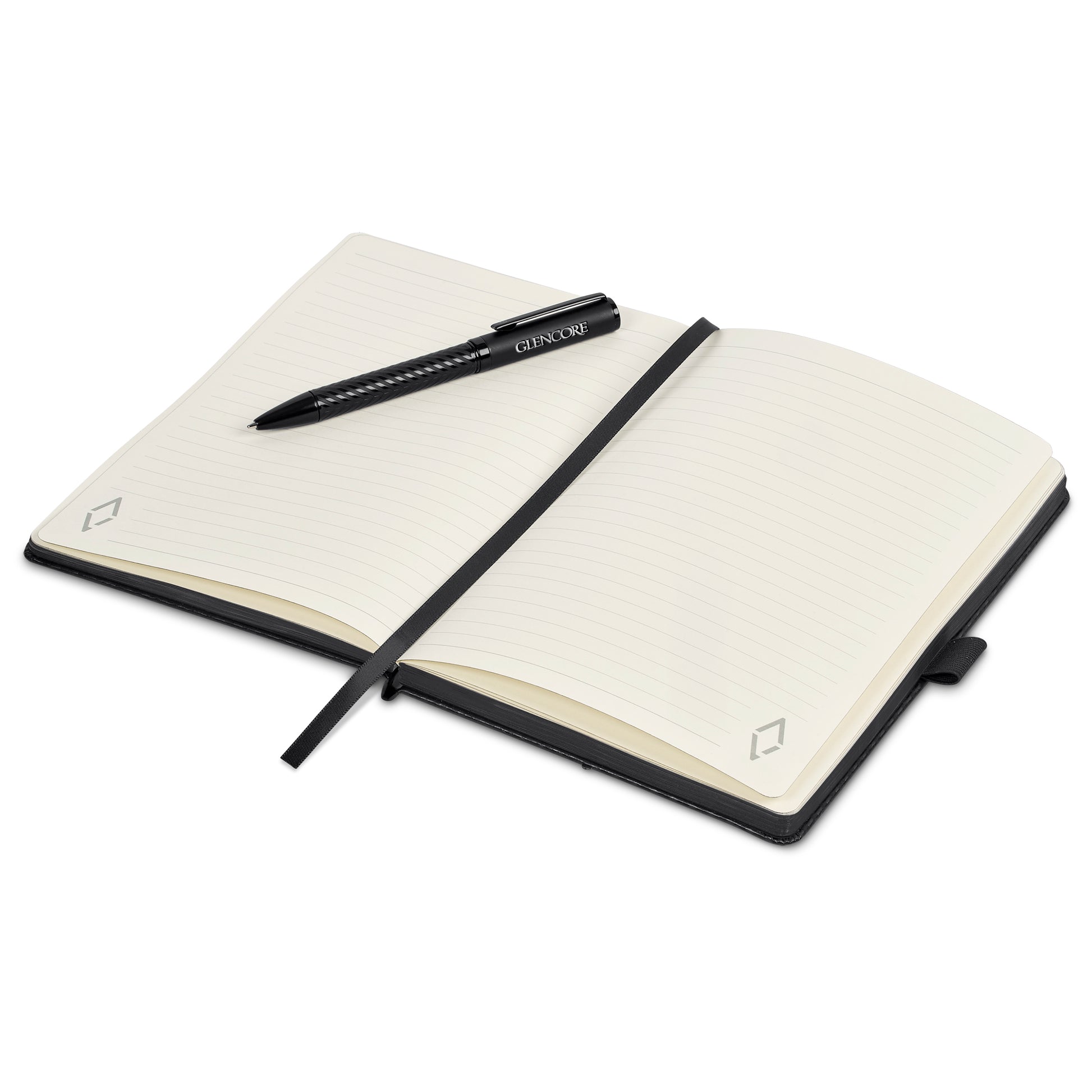 The carbon fibre-look cover of the notebook in this Alex Varga gift set gives it a cutting-edge look, which is stylishly finished off with black page edges. It’s paired with a ball pen which combines an embossed patterned lower barrel with a smooth, matte black upper barrel.