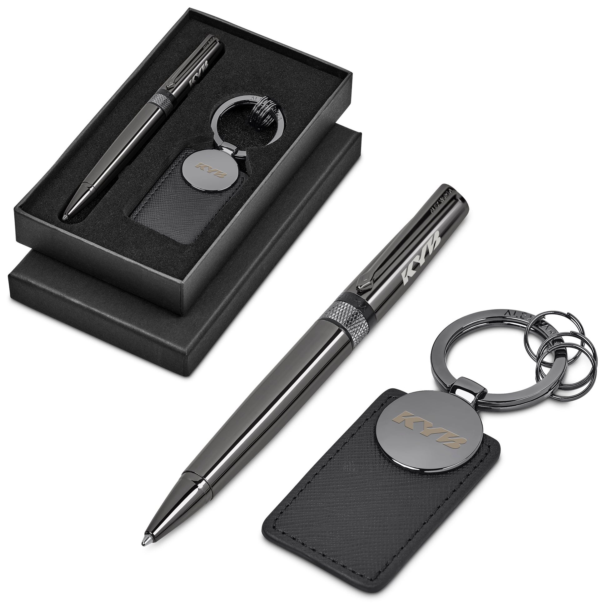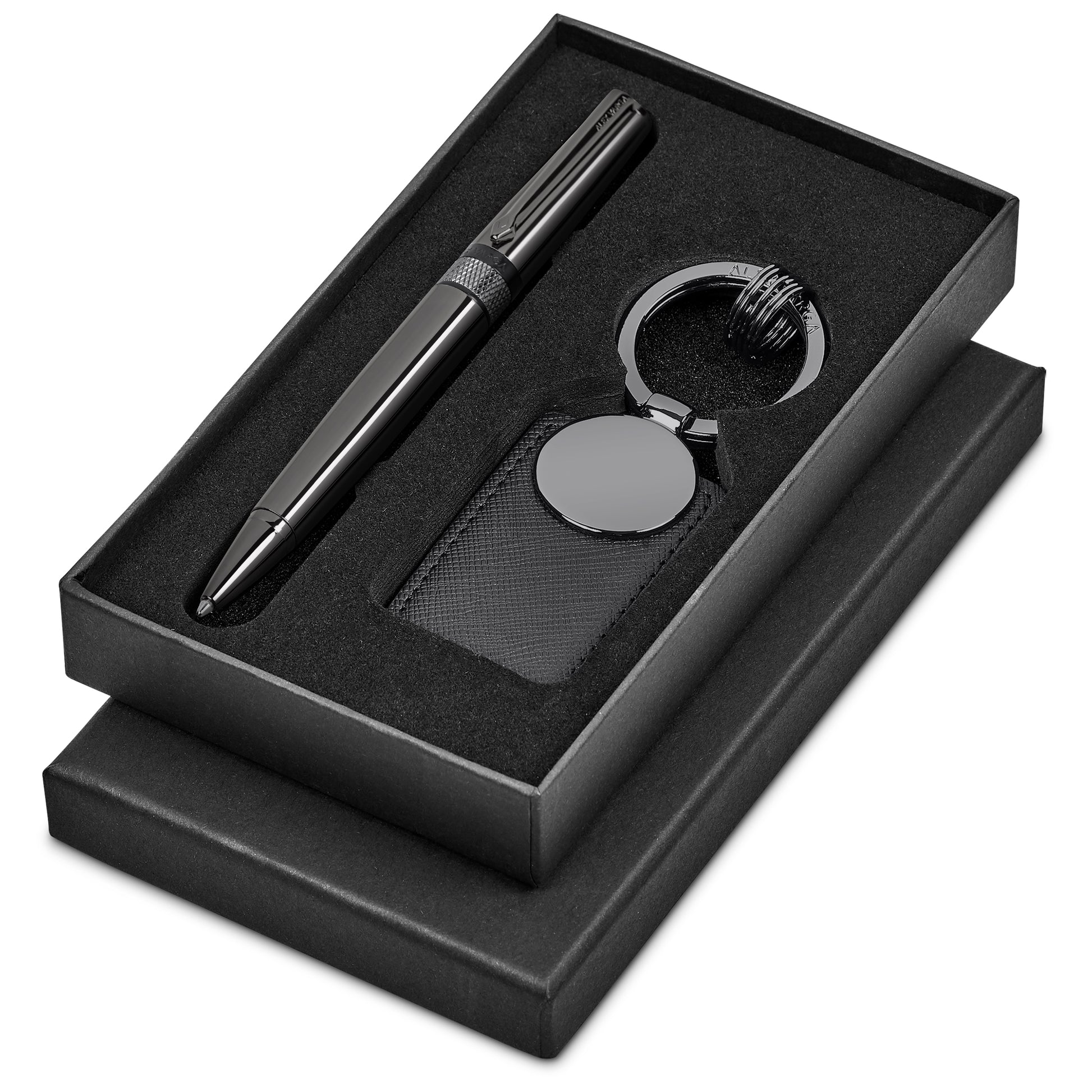 A high quality ball pen and a fashionable keyholder are packaged together in an elegant black, 2-piece presentation box.