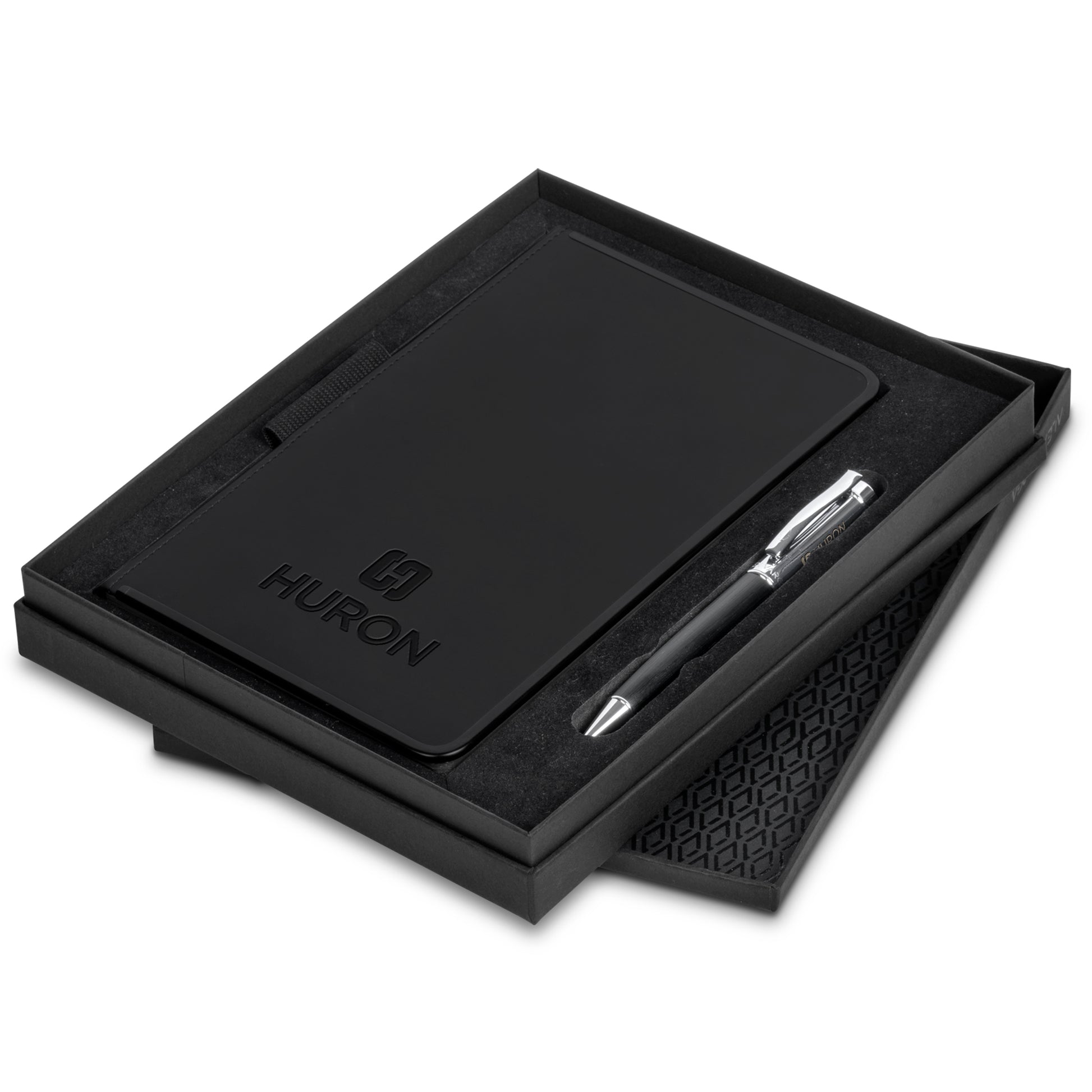 The soft and smooth, matte material of this hard cover notebook contrasts gracefully with the black metal frame, and the elasticated pen loop and painted edges finish off the product. It’s packaged together with a high performance Alex Varga Ball Pen to create a premium writing set.