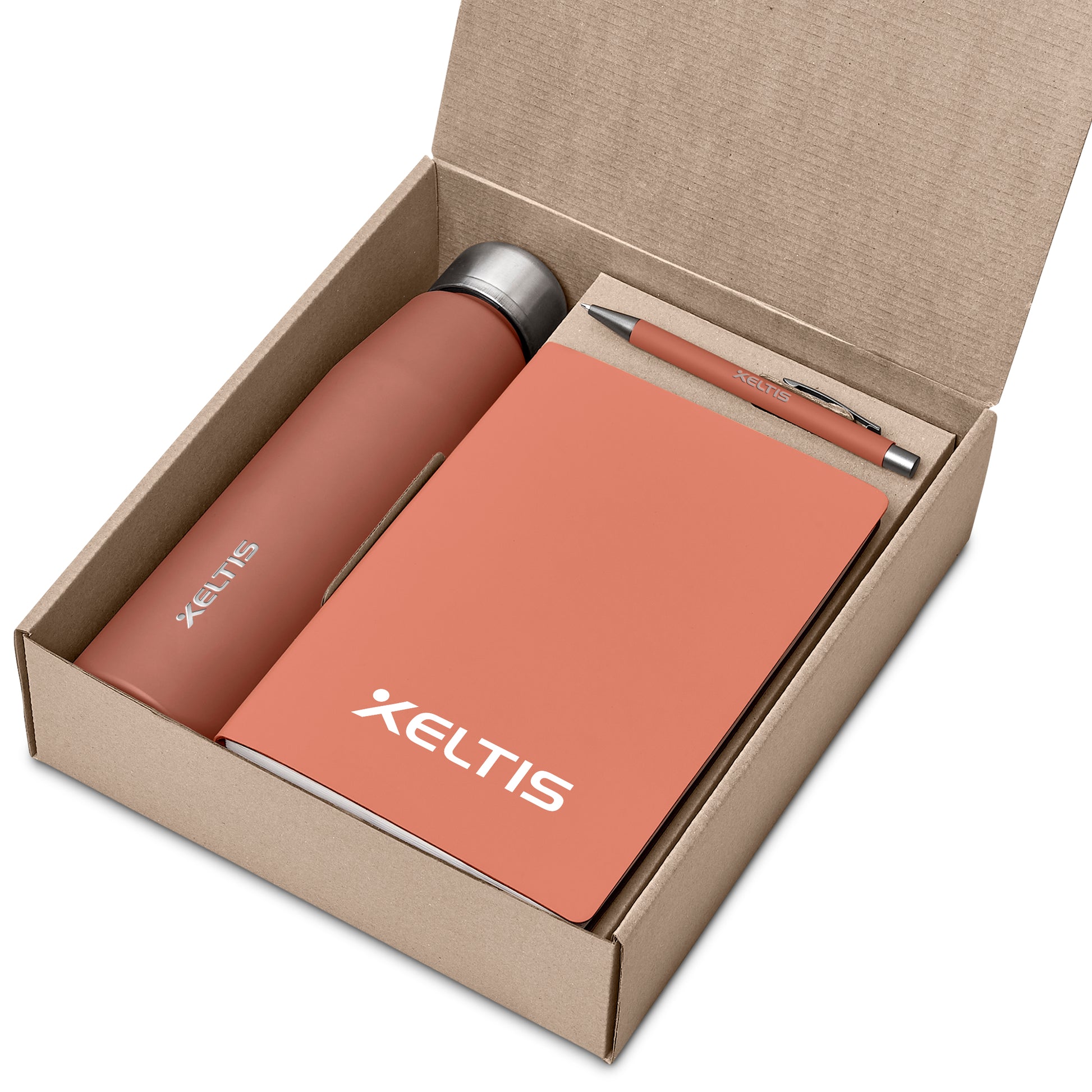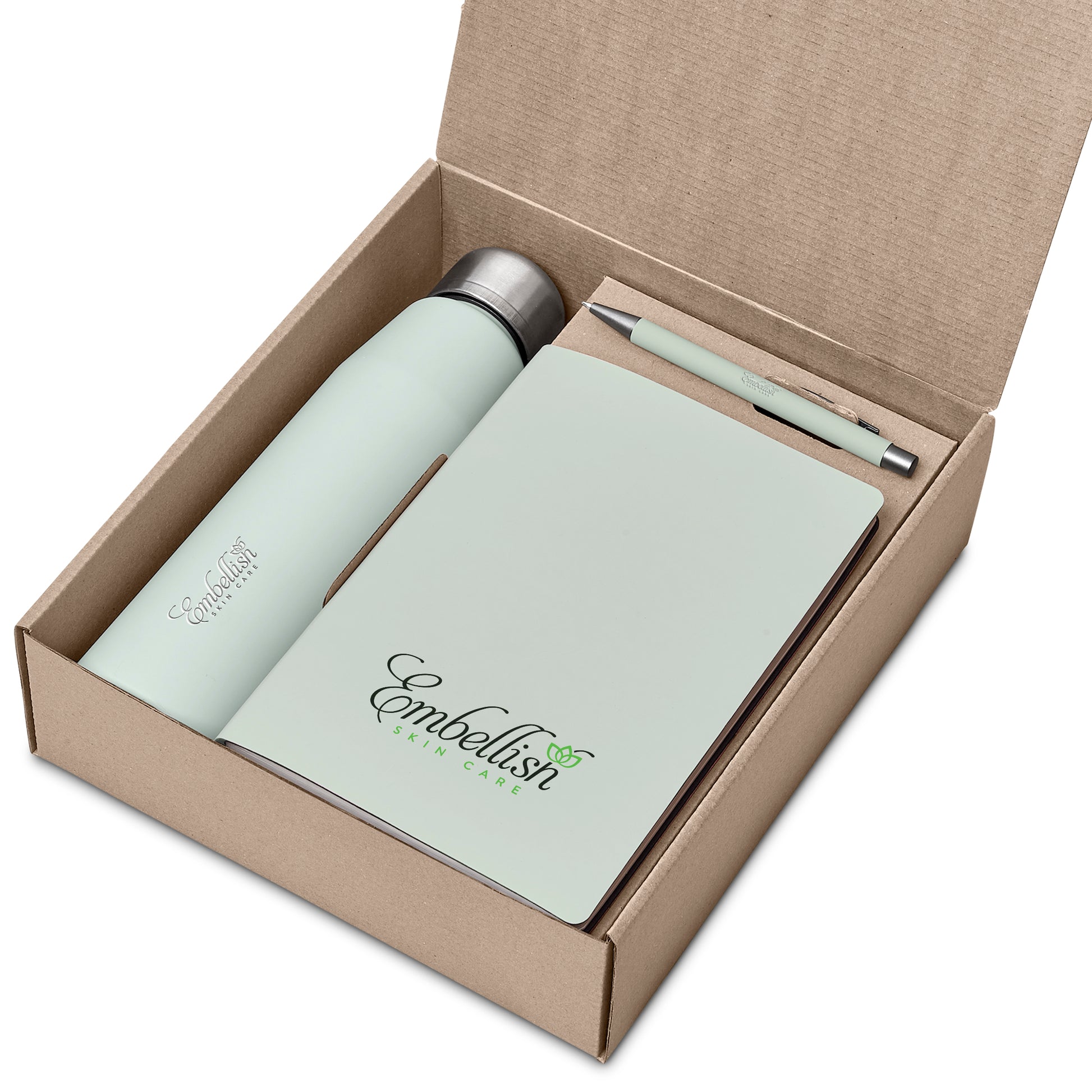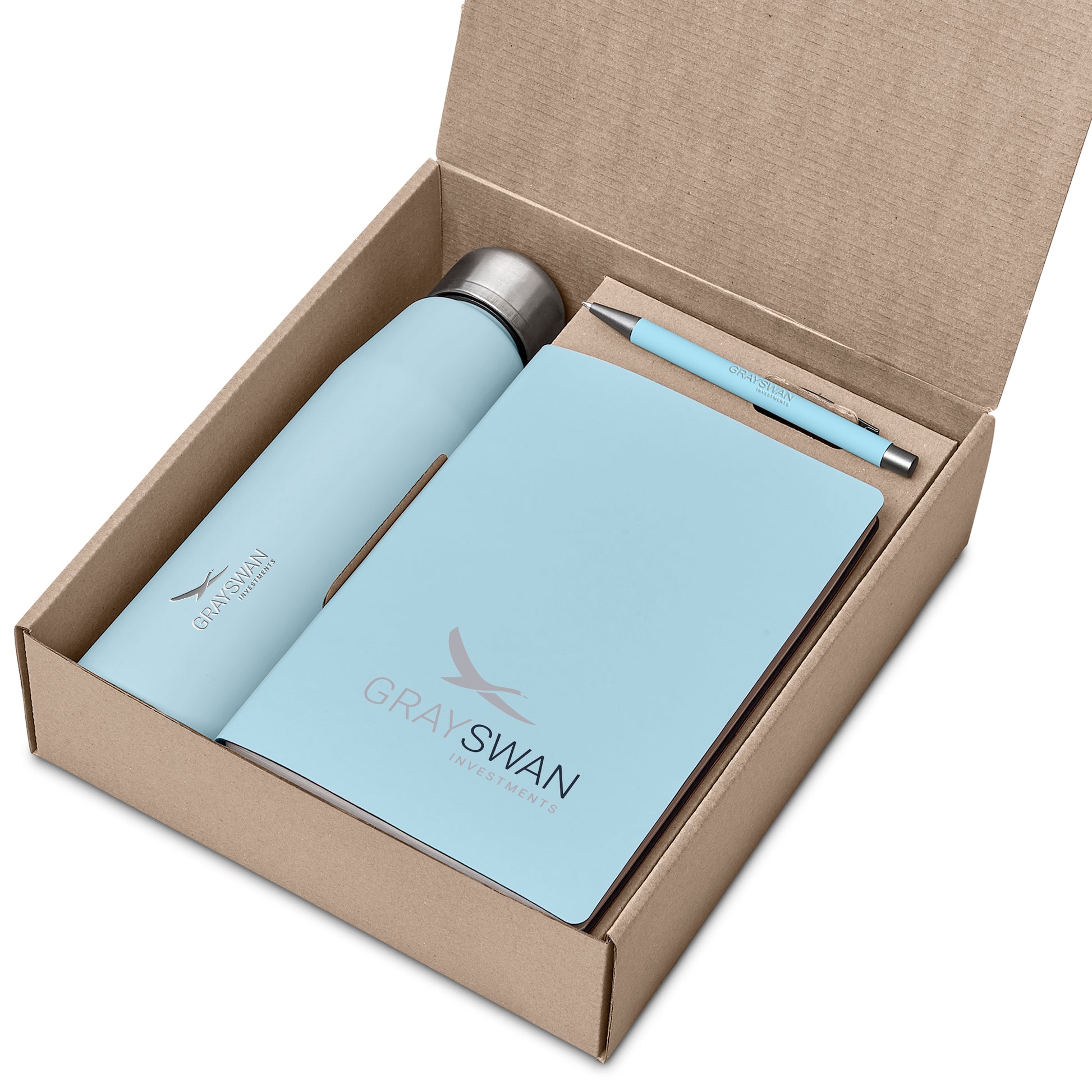 An aluminium bottle with a matte finish, a soft cover notebook and a ball pen are neatly presented together in a gift box. The pen has a matte finish and reveals a matte, light grey finish when lasered. This set is suitable as a client gift, or for staff and onboarding of new members to the team. A pre-packaged gift set not only looks impressive, but can also be a convenient and practical option when it comes to transport and delivery. If you’re looking for something a little different from your standard corporate and promotional colours, then consider this attractive gift set, which is offered in contemporary, fashionable colours.
